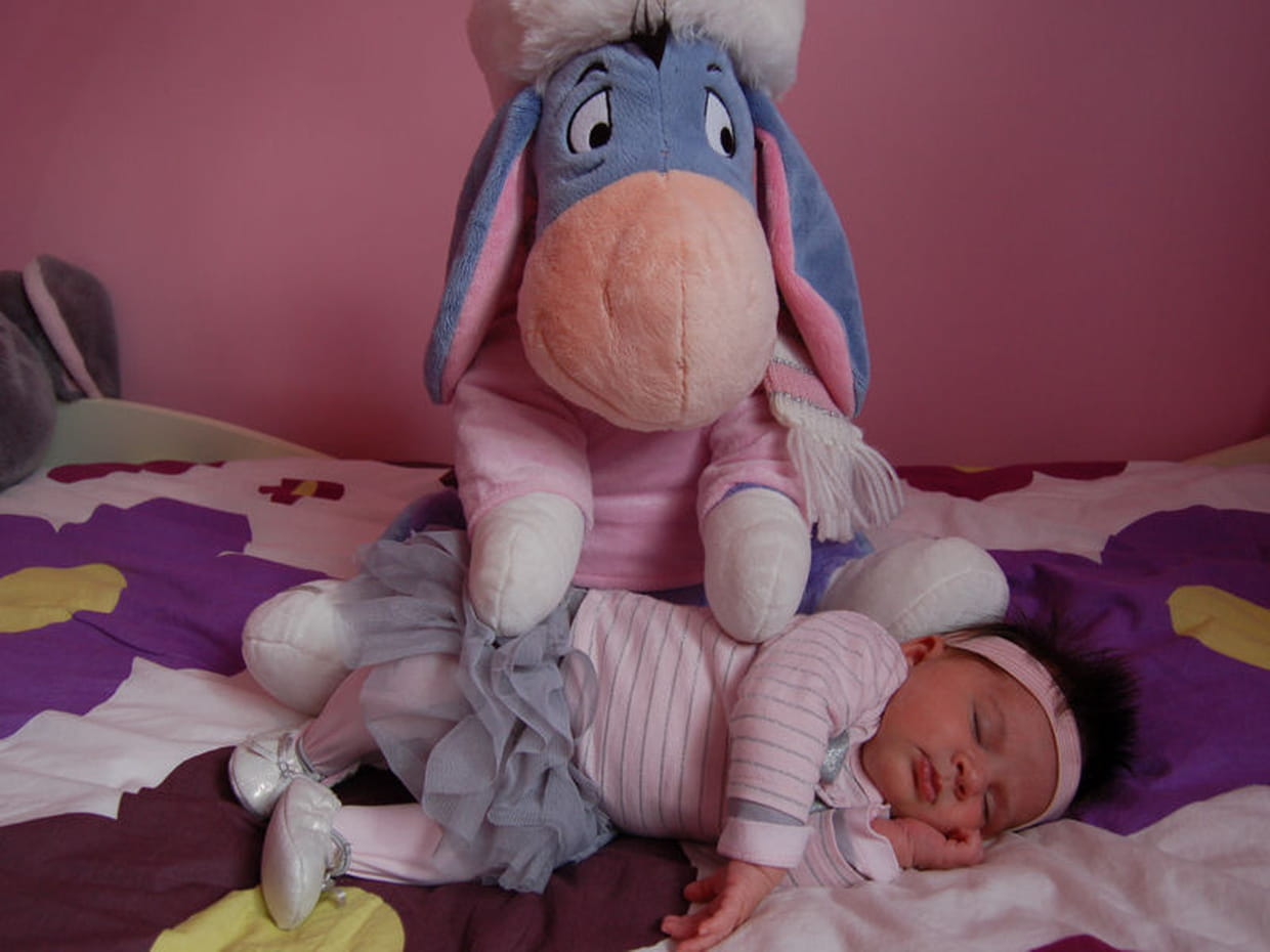 Tifenn, 2 mois s'est endormie dans le lit de sa grande sœur, sous la protection de Bourriquet, sa peluche préférée.