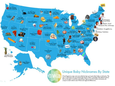 C'est pendant la grossesse que les parents commencent à surnommer leur bébé. L'application de grossesse Ovia a recensé les surnoms américains attribués aux Etats-Unis, pour chaque Etat. Si Cacahuète, Haricot et Bébé figurent parmi les surnoms les plus courants attribués aux nouveau-nés, d'autres surnoms encore plus originaux, voire même étranges sont plébiscités !