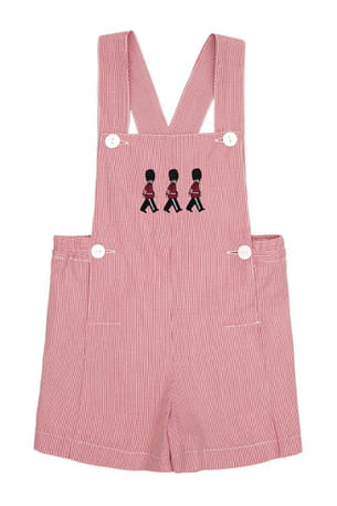 Si vous aimez le style classique, vous allez adorer cette combishort à rayures blanches et rouges. Avec ses gardes royaux sur le devant et ses boutons blancs, elle est très british !