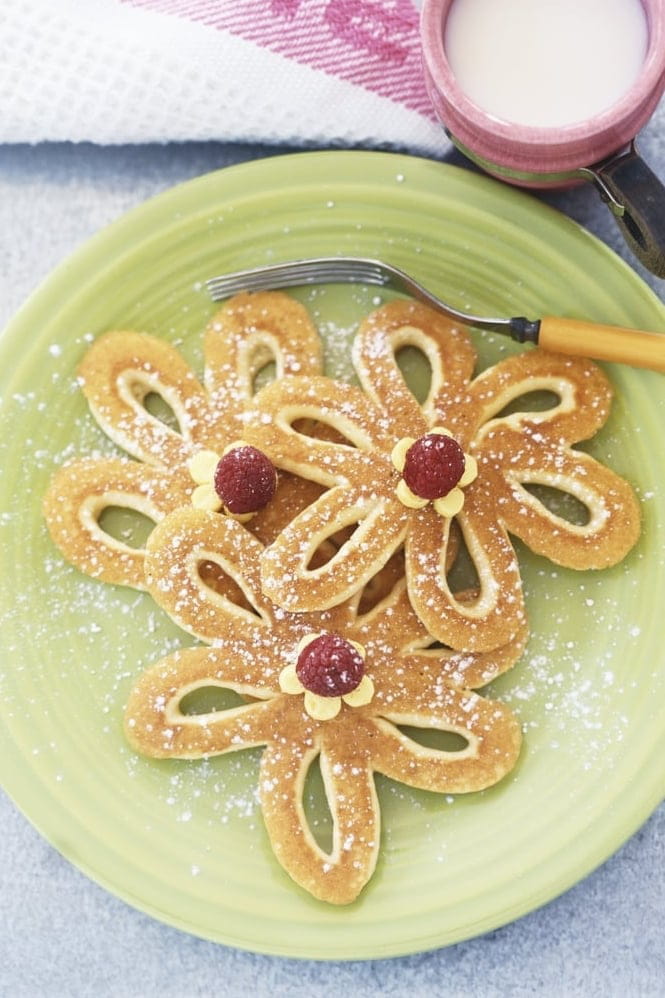 Les crêpes, tout le monde en raffole ! Mais celles-ci ont une forme originale et représentent de jolies fleurs. Décorez-les avec du sucre glace et placez en son centre une belle framboise. Sympa pour le goûter des enfants, non ?