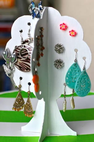 Pour réaliser ce joli porte-bijoux, dessinez puis découpez deux arbres de taille identique sur du carton bien rigide. Percez des trous pour pouvoir y accrocher vos boucles d'oreilles et faites une fente (l'un sur le dessus, l'autre sur le bas de l'arbre, en vertical) pour pouvoir les emboîter. Il ne vous reste plus qu'à accrocher vos bijoux et à l'offrir pour la fête des mères.