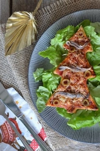 La pizza se réinvente en sapin : les anchois forment de jolies guirlandes et les olives, de scintillantes boules. Voici une façon originale d'allier la magie de Noël aux plats préférés des enfants !