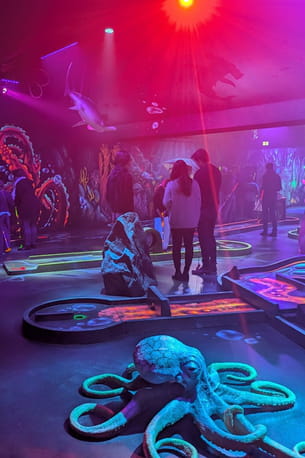 Au cœur de Bercy Village, cette nouvelle expérience immersive transporte les joueurs dans un voyage fantastique au cœur des océans, à la lumière des néons ! Ce mini-golf de 12 trous qui s'étend sur 300 m² est une sortie originale à faire avec les enfants dès 4 ans. Coraux, poissons tropicaux, vagues géantes et créatures marines mythiques font partie du décor, avec des peintures fluorescentes qui s'illuminent sous l'effet de la lumière noire, plongeant ainsi les participants dans un monde aquatique, fun et éducatif.