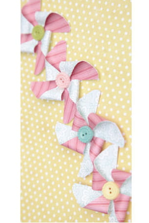 Découpez des carrés de 9 cm. Collez un bouton au centre du moulin.