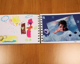 Pour mettre en scène une photo où Pauline barbote dans l'eau, on lui a demandé de dessiner la mer une nouvelle fois sur une feuille blanche. On l'a découpé et collé sur la photo. Pauline n'a pas manqué d'y mettre quelques poissons ! Elle a ajouté trois boutons en forme de poisson, créant ainsi un aspect de relief. Enfin dans les chutes de découpe de la photo, on a écrit les premières lettres de chaque mot du titre de la page. Ainsi cela fait un rappel des couleurs de la photo.