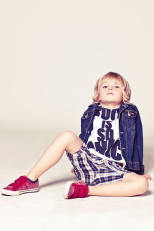 Décontractée et très tendance, cette tenue est composée d'un tee-shirt à imprimé et d'un bermuda à carreaux. Une veste en denim complète le tout. La classe !