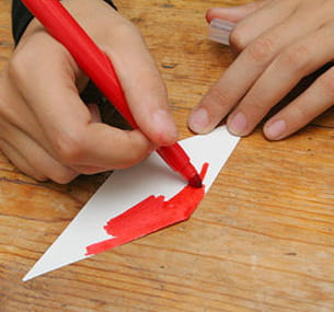 Prenez votre feutre et coloriez en rouge les deux losanges. Il ne doit plus rester de blanc du tout ! Laissez bien sécher.