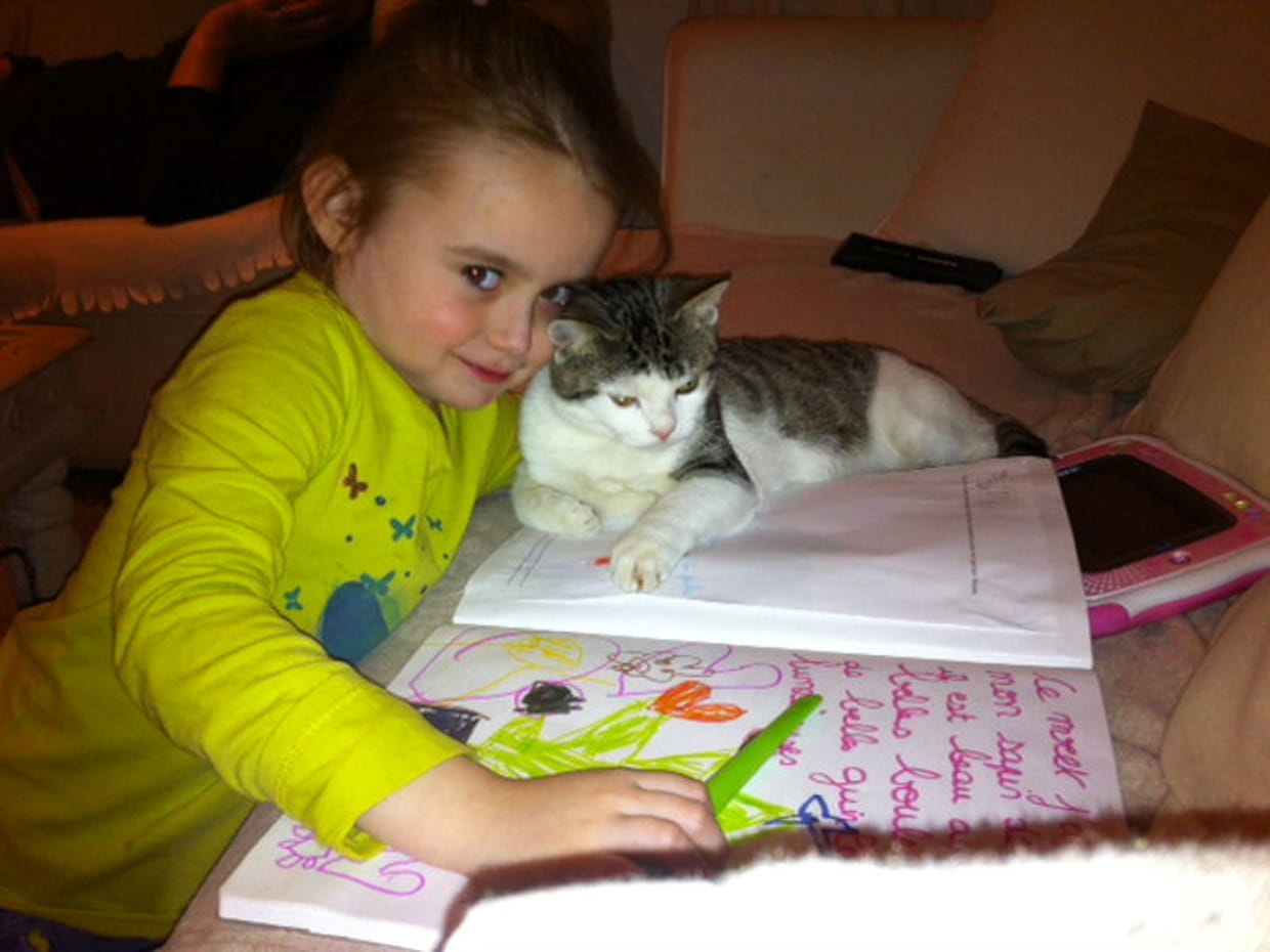 "Un copain m'aide à faire mes devoirs... Chat alors !" indique la maman. Une photo malicieuse qui leur permet de gagner une invitation pour découvrir le dernier dessin animé de StudioCanal.