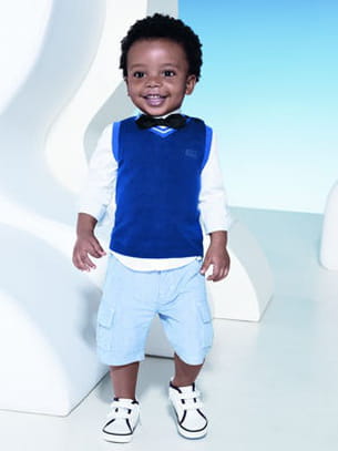 Votre petit gentleman sera craquant avec cette chemise rayée en popeline, ce débardeur en tricot et son bermuda rayé. Le détail coquet ? Le nœud en papillon à soie.
