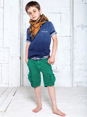 Un esprit citadin avec ce look constitué d'un polo bleu porté sur un bermuda vert à carreaux.