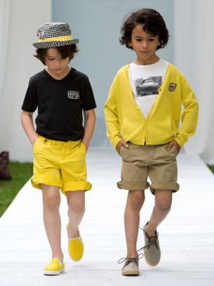 Le jaune flashy va bien aux petits garçons. La preuve par 2 avec ces looks à la fois élégants et décontractés. A gauche, le tee-shirt noir est rehaussé d'une poche à carreaux porté sur un short jaune. A droite, un tee-shirt sérigraphié sous un cardigan en coton avec un short beige.