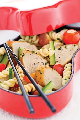 Quoi de mieux pour régaler toute la famille qu'une grande salade composée ? On y met des pâtes, des concombres, des tomates cerises et des émincés de poulet ! Le pique-nique est prêt !