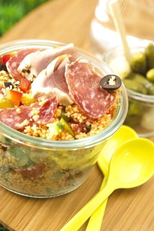 Le taboulé est la salade du pique-nique par excellence ! Celle-ci est revisitée avec du saucisson et des miettes de thon ! Une association terre et mer parfaite pour la saison estivale !