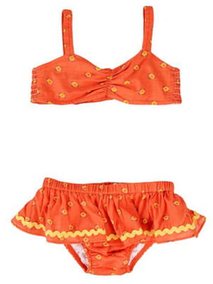 Pour être aussi mignonne qu'une vraie Brésilienne, ce bikini orangé imprimé de quelques motifs jaunes est parfait.