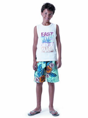 Que mettre dans la valise de Junior pour aller à Rio de Janeiro ? Cette tenue composée d'un tee-shirt aux imprimés "east coast" porté sur un short de bain très tropical.
