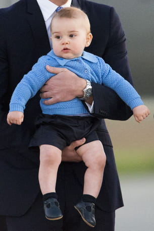 Le petit George va certainement fréquenter les meilleures écoles Outre-Manche. Il se prépare déjà à l'uniforme avec ce look sage : un short gris épais et un gilet bleu à col. On remarque également qu'il ne quitte pas ses petites sandales.