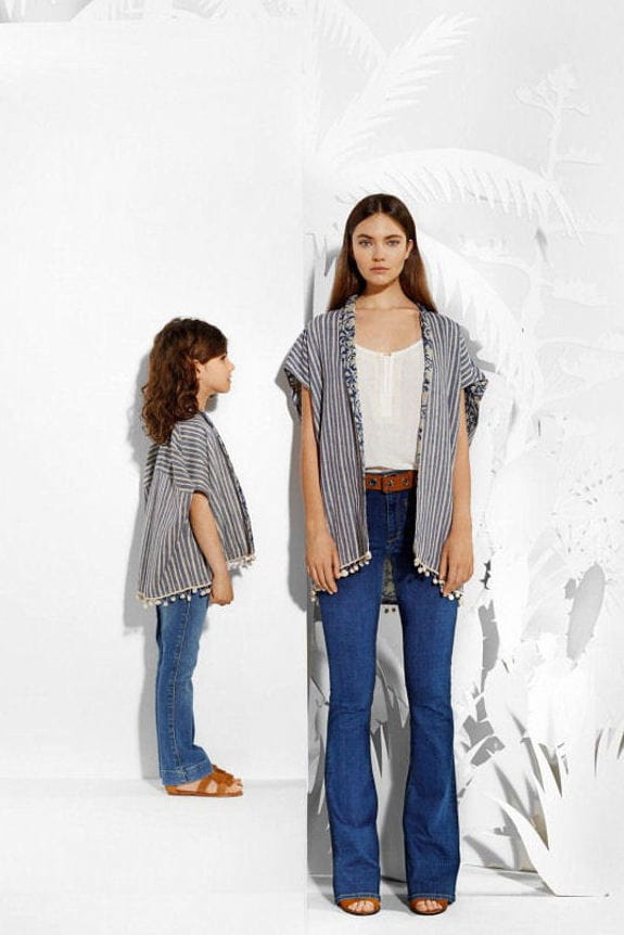 Léger et réversible, ce kimono à imprimé "tapisserie" et à pompons convient totalement pour l’été. Associez-le toutes les deux à un jean et à un haut blanc et jouez la carte mère/fille sans retenue.