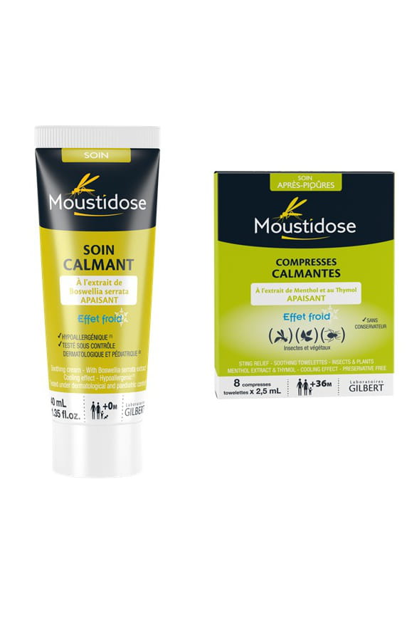Votre enfant s'est fait piquer par un moustique ? Pour apaiser ses douleurs et ses démangeaisons, utiliser un soin calmant peut être efficace. À base d’extrait de boswella serrata, reconnue pour ses propriétés désinfectantes et anti-inflammatoires, le soin calmant Moustidose,  hypoallergénique, sans alcool ni parfum, apaise les démangeaisons, les irritations et les rougeurs superficielles. Sa texture hydrogel lui confère un effet froid qui soulage immédiatement l'enfant dès 3 mois. Pratiques également et à emporter avec vous pendant les vacances, les compresses calmantes, formulées à base de menthol, et de thymol, agissent rapidement contre les piqûres d'insectes ou de végétaux.