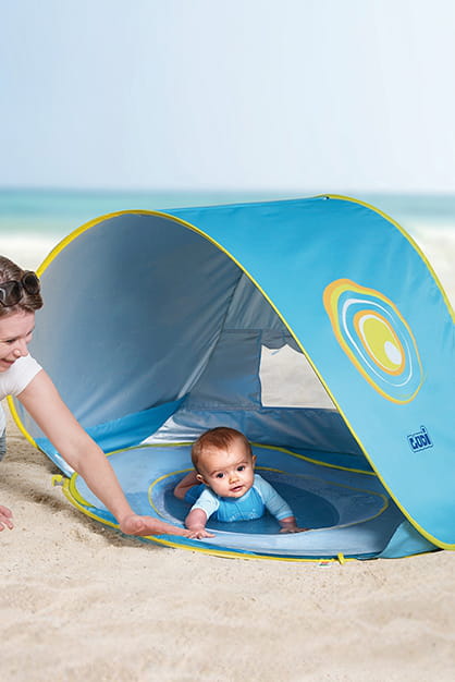 On craque pour cette piscine évolutive et nomade, qui se range dans un sac à dos. Ultra-pratique pour des vacances avec bébé, cette piscine pop'up fait aussi office de tente pour protéger bébé du soleil, et de pataugeoire pour le laisser barboter en toute tranquillité.