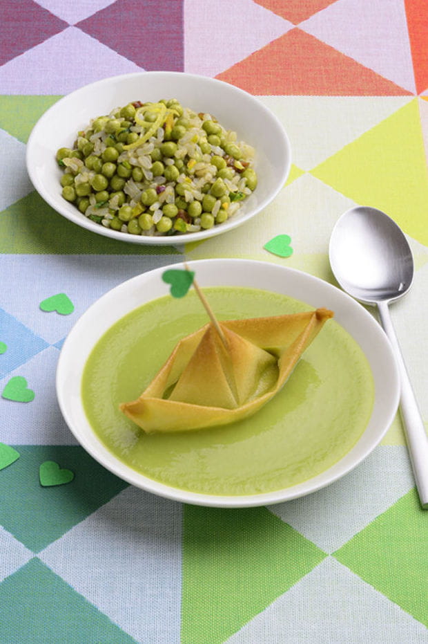 Si votre enfant n'apprécie pas les petits pois/carottes, essayez cette soupe aux petits pois. Servie avec le bateau en feuille de brick, elle ne devrait pas laisser votre bambin indifférent !