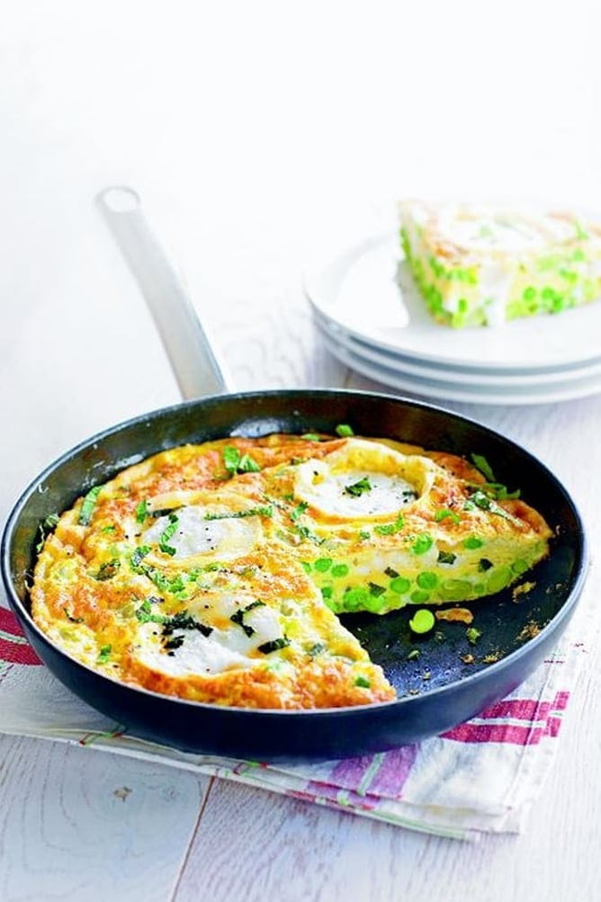 Cette omelette renferme des petits pois fondants, des morceaux de chèvre et quelques brins de menthe. Un délice !