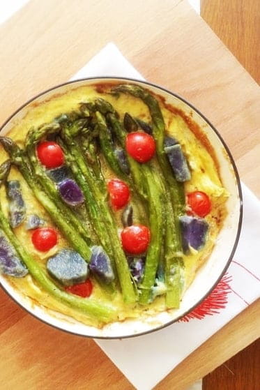 Agrémentez vos omelettes avec des tomates cerises, des asperges et des pommes de terre vitelottes. Super idée pour faire goûter aux enfants !