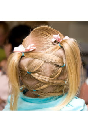 Pour réaliser cette coiffure originale, choisissez huit élastiques colorés. Séparez les cheveux de manière à attacher huit petites queue de cheval (4 de chaque côté) que vous joignez les unes aux autres sur le côté opposé, en les attachant finalement ensemble. Posez deux petites barrettes à noeud sur le dessus et le tour est joué !