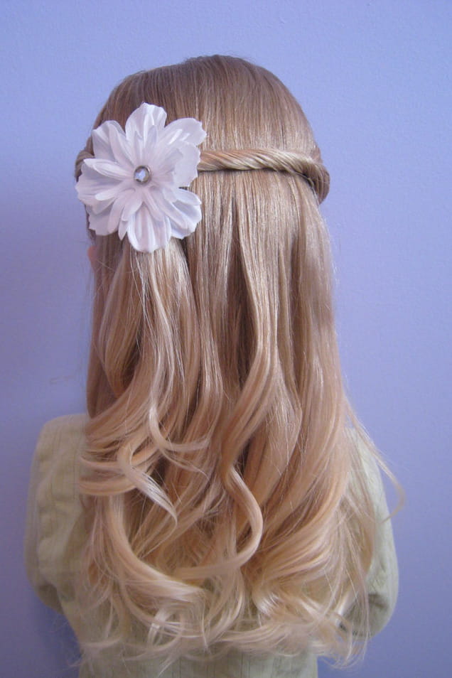 Désormais, plus besoin de headband pour coiffer vos enfants de manière tendance. Les deux mèches de devant, torsadées, font ici l'affaire. Elles s'attachent avec une jolie fleur ou une barrette en forme de noeud.