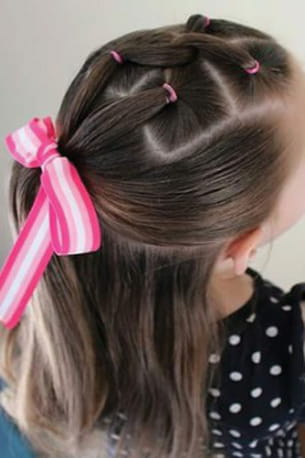 Pour apporter un peu plus d'effet à une demi-queue de cheval, inspirez-vous de cette coiffure pour enfant. Commencez par deux petites couettes sur le haut de la tête que vous croisez pour les attacher avec les deux autres couettes situées sur le milieu du crâne. Puis, terminez en attachant le tout avec la demi-queue, à l'aide d'un joli ruban.