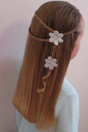 Tressez deux mèches fines sur le haut de la tête, des deux côtés, une troisième sur le côté gauche (un peu plus bas), et joignez le tout avec une fleur. Terminez avec les cheveux restants en créant une autre tresse. Une seconde fleur permet de faire la séparation entre la tresse et les petites boucles sur la mèche du bas.