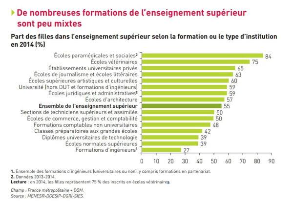 Dans l'enseignement supérieur, ces différences entre filles et garçons persistent. L'observatoire des statistiques révèle que les femmes sont plus souvent diplômées que les hommes après le bac. Par ailleurs, même si la part des femmes a augmenté parmi les ingénieurs entre 2000 (23 %) et 2013 (29 %), elles restent très minoritaires par rapport aux hommes. Même chose pour les femmes titulaires d'un doctorat scientifique : elles étaient 35 % en 2005 contre 39 % en 2013.
