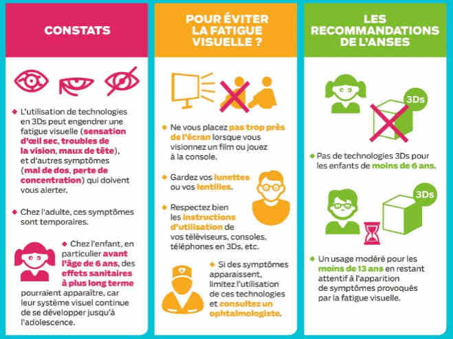 Comment les utiliser ? Pour l'Agence nationale de sécurité sanitaire (Anses), les enfants de moins de 6 ans ne doivent pas utiliser les technologies 3Ds. Elle recommande par ailleurs à ce que l'usage de ces technologies soit modéré pour les enfants de moins de 13 ans "en restant attentif à l'apparition de symptômes provoqués par la fatigue visuelle". Pour les plus de 6 ans, il est également nécessaire de prendre quelques précautions afin d'éviter cette fatigue. Un enfant ne doit ainsi pas se placer trop près de l'écran, et ce qu'il regarde un film ou qu'il joue à la console. Il est aussi essentiel qu'il garde ses lunettes ou ses lentilles. Evidemment, si l'un des symptômes de fatigue visuelle apparaît, il faut limiter l'utilisation de ces technologies et consulter un ophtalmologiste.