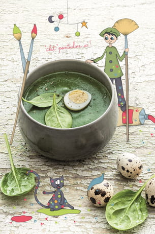 Les épinards ne sont pas du goût de tous les enfants. Mais ce délicieux velouté vert accompagné d’œufs de caille devrait les mettre en appétit. Recette tirée du livre Secrets de soupes aux Editions Les P'tits Bérets.