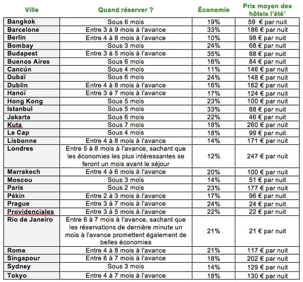 Pour l'été 2017 (entre juin et août), réserver au bon moment peut vous permettre d'économiser jusqu'à 26 % en moyenne sur l'hébergement, d'après une étude Tripadvisor intitulée "Meilleur moment pour réserver". Les prix varient ainsi selon les destinations : à Barcelone par exemple, en réservant entre 3 à 6 mois à l'avance, vous pouvez économiser 33% du prix de l'hôtel à cette période. Pour partir à Londres, les économies les plus intéressantes se font néanmoins un mois avant le départ.