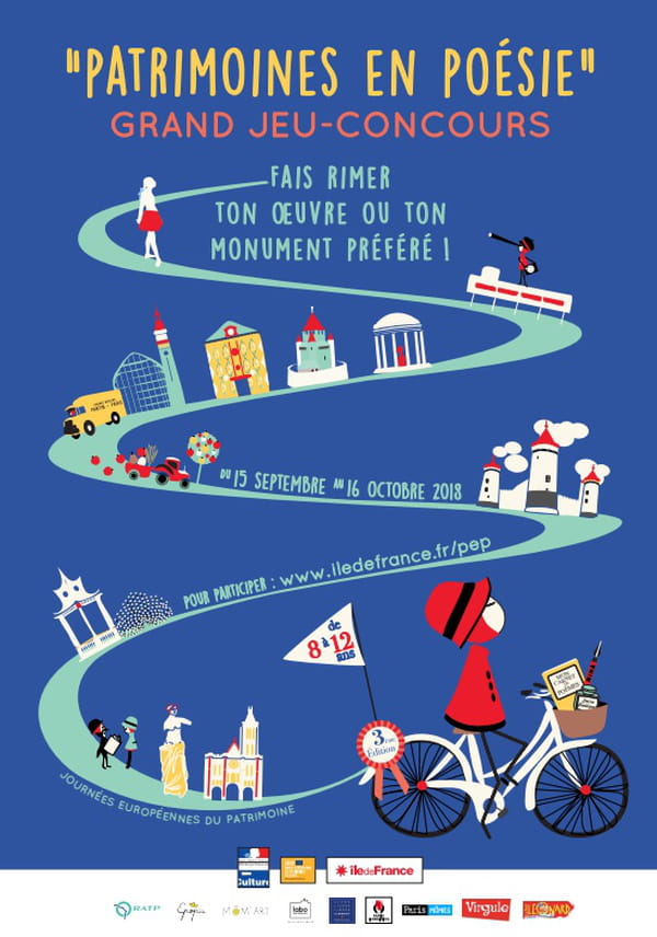 [Mis à jour le 18/09/18] La troisième édition du jeu-concours "Patrimoines en poésie", invite les enfants âgés de 8 à 12 ans à laisser libre cours à leur imagination pour décrire, dans un poème, l'œuvre ou le monument qu'ils préfèrent en Ile-de-France. Comment ça marche ? Les enfants peuvent participer en individuel dans le cadre familial ou dans le cadre d'un atelier d'écriture organisé dans les écoles partenaires, les médiathèques ou certains musées (voir la carte des ateliers d'écriture). Ensuite, ils devront envoyer leur poésie, accompagné d'un coupon-réponse, avant le 16 octobre 2018. Les 12 grands gagnants, désignés début novembre par un jury constitué de professionnels de la culture et de l'éducation, remporteront de nombreux lots comme des chèques-lire, des ciné-chèques, un abonnement à une aventure Epopia, un magazine d'initiation à l'art et surtout, la publication de leur poésie dans un recueil de poèmes.