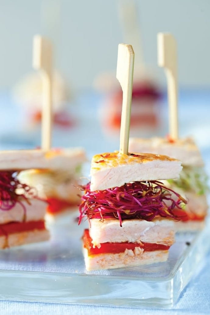 Pour l'apéro ou en entrée, réalisez ces mini clubs sandwichs, à la dinde, à la tomate et aux pousses de radis. Une surprise en bouche !