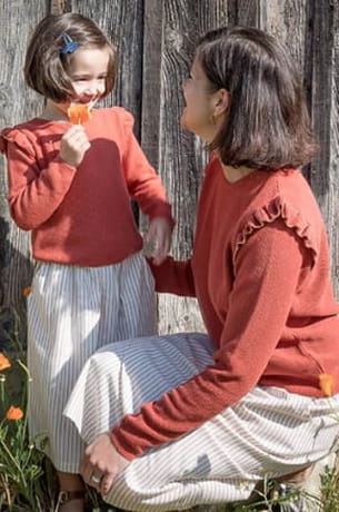 Pour accueillir le printemps, mère et fille portent une jupe et un pull assortis de la marque LiliLotte. La ressemblance est frappante, jusqu'à la coupe au carré.