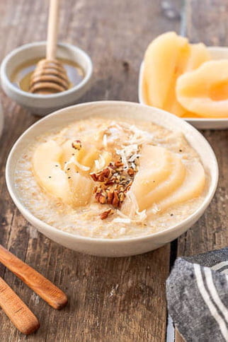 Recette anglo-saxonne typique, ce porridge marie avec bonheur la douceur de la poire et la note exotique de la noix de coco.