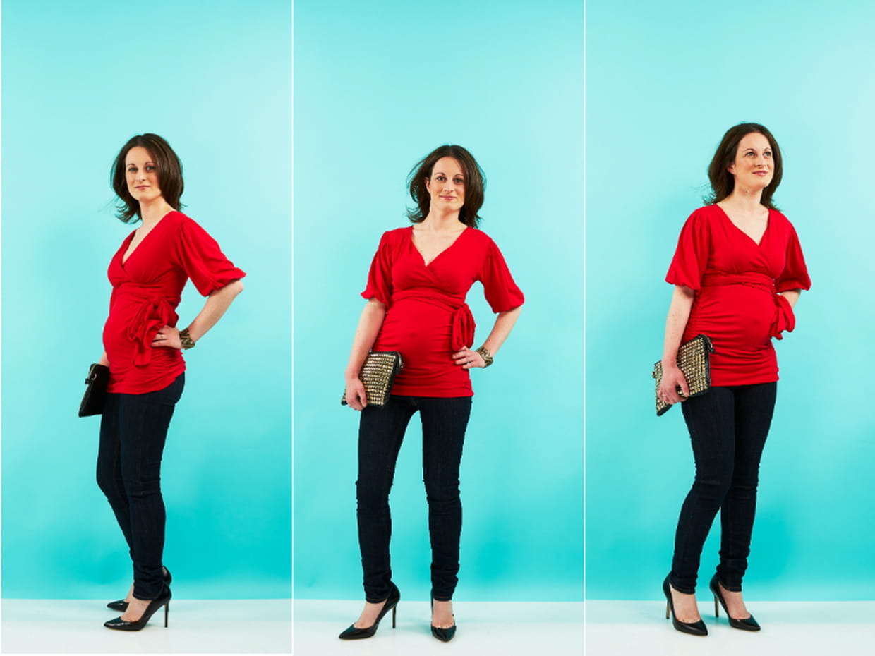 Laurianne est prête pour la séance shooting photos professionnelle. La voici vêtue d'un top de grossesse rouge à manches ballon et gros noeud qui souligne à merveille la poitrine et dessine son joli ventre de future maman. Côté pantalon, un slim noir, à la fois confortable et élégant pour les femmes enceintes.
