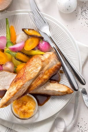 Suprême de chapon, chutney de mangue, petits légumes © Label Rouge