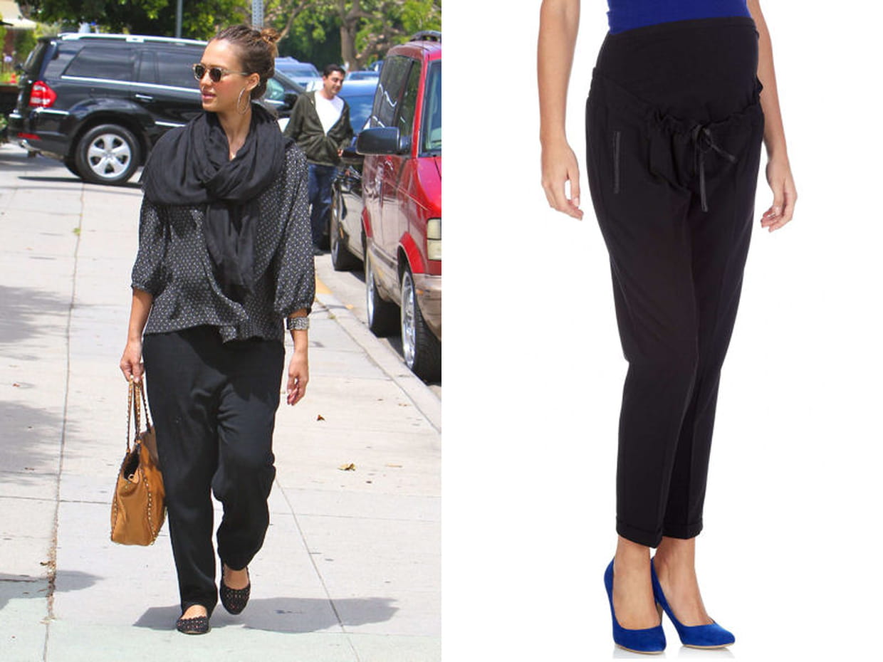 Jessica Alba a tout compris. Elle ne sacrifie pas son confort au look en optant pour un sarouel fluide et une blouse à pois pour la touche glamour. Une douce écharpe XXL et l'allure est parfaite. Pour l'imiter, on se rue sur le pantalon aux détails cuirs de Kiabi (19,99 € soldé 5,99 €).
