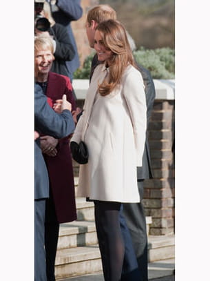 Pour couvrir sa jolie robe d'écolière, Kate Middleton a opté pour un manteau beige. Elle n'oublie pas de souligner son ventre en portant sa pochette devant elle.