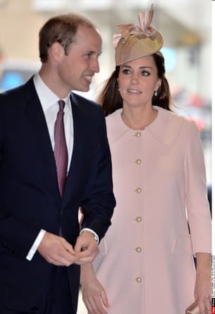 Kate Middleton, au bras du prince William à l'occasion du Commonwealth Observance le 9 mars 2015, porte un manteau rose pâle signé Alexander McQueen, assorti à un joli accessoire de tête, dans les mêmes tons.