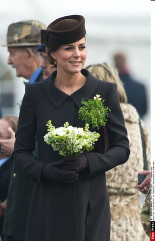 Voici la Duchesse de Cambridge, toujours aussi rayonnante. A l'occasion de la parade de la Saint-Patrick à Aldershot, la Duchesse de Cambridge, a choisi un manteau marron singé Catherine Walker, et un chapeau de Lock And Company. Une tenue sobre et élégante pour la future maman.