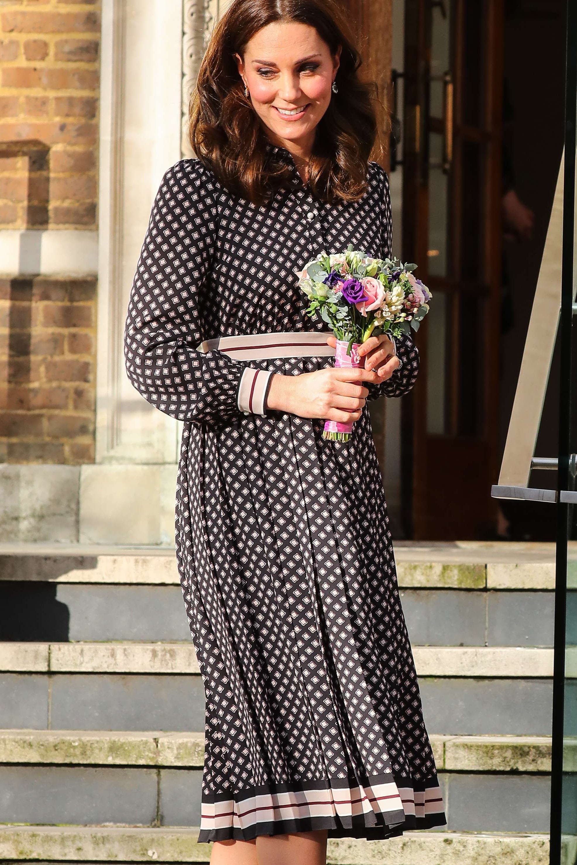 La future maman s'est rendue au Musée Foundling à Londres et a porté pour cette occasion une robe plissée de la marque américaine Kate Spade. L'imprimé graphique noir et blanc, la coupe évasée et l'effet de plis mettent en valeur son ventre très légèrement arrondi. Pour parfaire sa tenue, la duchesse de Cambridge a opté pour des escarpins bordeaux.