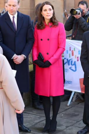 Kate Middleton adore les manteaux : tout au long de sa grossesse, elle portait des cabans et autres trenchs de toutes les couleurs ! Pour la visite de la cathédrale de Coventry en Angleterre, elle a opté pour un manteau long de couleur rose fuchsia, qu'elle a assorti avec des collants opaques, une pochette discrète, des bottines et des gants, le tout de couleur noire.