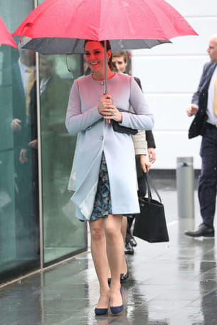 Lors de la visite d'un Institut de Neurosciences et de Psychologie du King's College de Londres, la Duchesse de Cambridge portait une robe courte à fleurs qu'elle a réchauffé avec un paletot long bleu très clair. Une tenue plutôt printanière malgré le mauvais temps ! Des escarpins en daim noir et une pochette assortie venaient accessoiriser sa tenue.