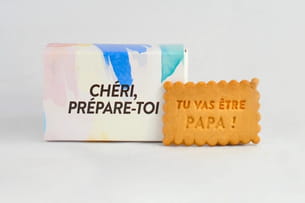 Pour annoncer l'arrivée de Bébé à leurs proches, Shanty Biscuits propose aux futures mamans un set de 4 mini-coffrets de 6 biscuits, chacun avec un message différent : pour le futur papa (Chéri, prépare-toi / tu vas être papa !), les futurs grands-parents (Tu es une maman géniale / Tu seras une mamie formidable ", "Tu es un super papa / Tu seras un papi formidable !) et, le quatrième, avec un message plus neutre pour la personne de leur choix. Les Shanty Biscuits sont sans conservateur, sans additif, sans arôme artificiel, sans colorant et sans encre alimentaire... Leurs boîtes en carton sont fabriquées en Isère, la farine provient des Hauts de France, le beurre de Bretagne, la fleur de sel de Camargue et les emballages plastiques sont recyclés et recyclables ! Assortiment de 4 boîtes de 6 biscuits : 38 euros.  A commander sur le site de Shanty Biscuits