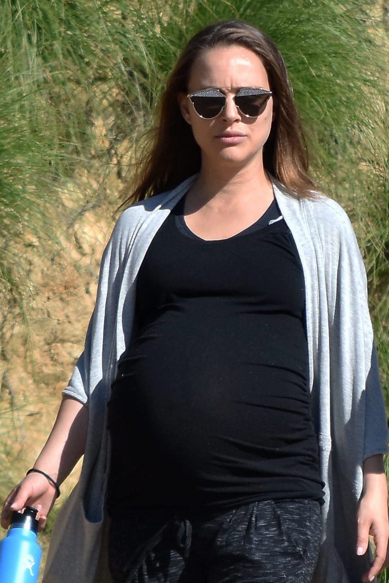 Vêtue d'un tee-shirt et d'un pantalon de sport, une bouteille à la main, Natalie Portman a besoin de marcher, à quelques semaines de la naissance de son bébé.