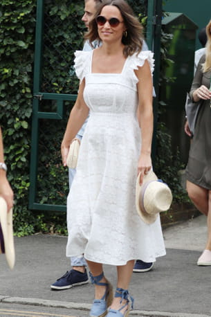 Le 5 juillet 2018 à Wimbledon, Pippa Middleton, alors enceinte de 5 mois, avait enfilé une robe rétro blanche immaculée en broderies anglaises que la supportrice de choc avait assortie à des espadrilles compensées en denim et à un canotier écru. Ce qu'on retient de ce look ? Les bretelles à volants et la taille très soulignée de ce modèle signé Anna Mason. Un sans-faute pour la future maman !